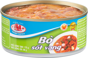 Thịt bò ≥ 50%, nước, mỡ heo, bia, rượu, bột mì, đường kính, hành, cà chua, tỏi, muối ăn, chất điều vị (INS 621), tinh bột biến tính (INS 1442), tiêu, chiết xuất ớt, ngũ vị hương.