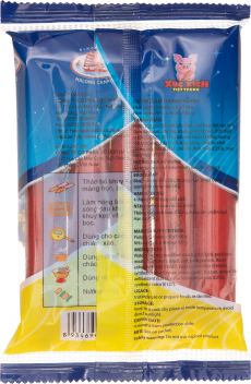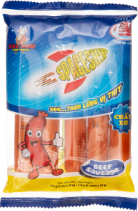 Water, chicken, modified starch, pork lard, pork lean meat, beef, soy protein, sugar, salt, flavor enhancer (E621, E627, E631), emulsifiers (E450iii), synthetic meat flavor, onion, garlic, ginger, pepper, fiber, antioxidant (E316), calcium, DHA, color retention agent (E250), synthetic color (E127).